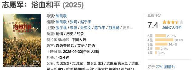从目前趋势来看,最为抢眼的要数《志愿军3》,不论是影片主题还是实际内容,都跟国庆档期最为契合。该影片上映后,在网上掀起了不少网友的热议,尽管有吐槽的声音,但整体上的口碑还是值得肯定的,目前豆瓣评分拿到了7.4分。